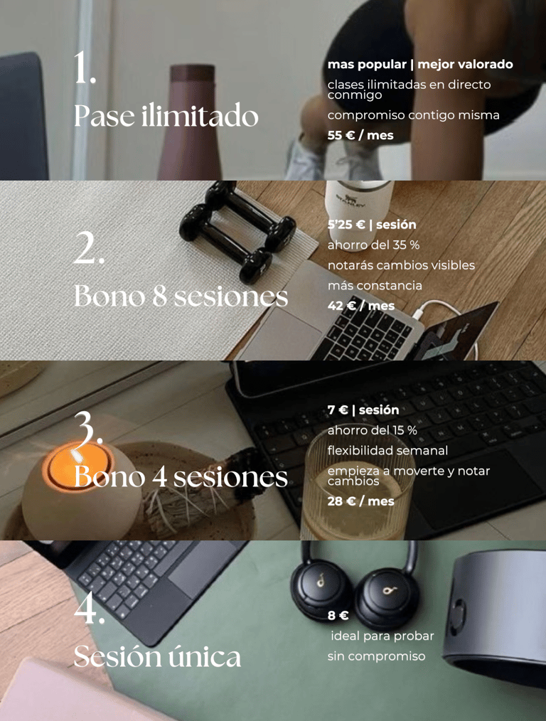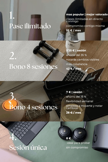 Clases grupales online en directo, sesiones en la playa y sesiones privadas adaptadas a tus objetivos.